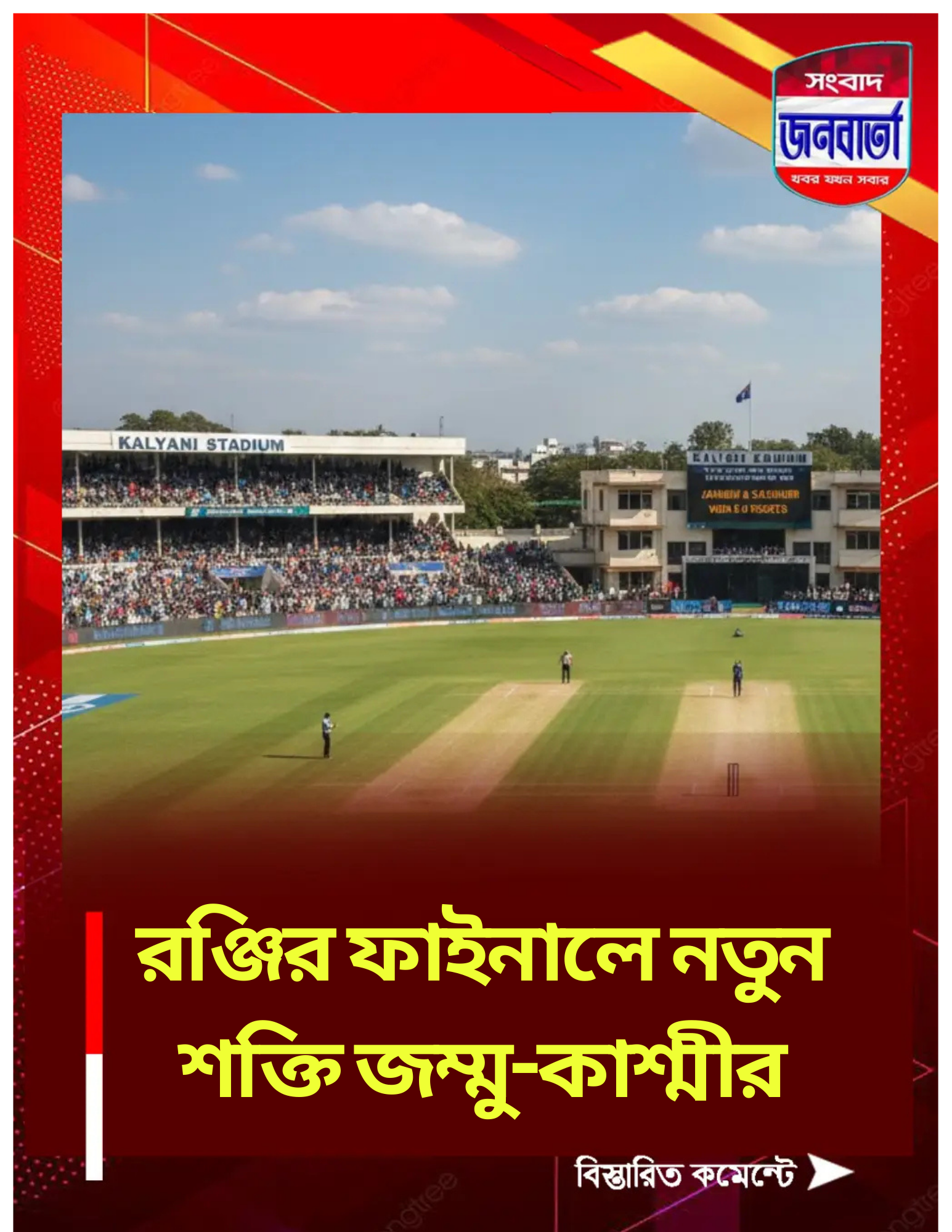ঘরের মাঠে চেনা পরিবেশে রূপকথার গল্প লিখতে চেয়েছিল বাংলা, কিন্তু শেষ পর্যন্ত স্বপ্নভঙ্গ হলো মনোজ তিওয়ারিদের। কল্যাণী স্টেডিয়ামে রঞ্জি ট্রফির সেমিফাইনালে বাংলাকে ৬ উইকেটে পরাজিত করে ইতিহাস গড়ল জম্মু-কাশ্মীর। এই অভাবনীয় জয়ের ফলে টুর্নামেন্টের ইতিহাসে প্রথমবারের মতো রঞ্জি ট্রফির ফাইনালে নিজেদের জায়গা পাকা করল তারা।