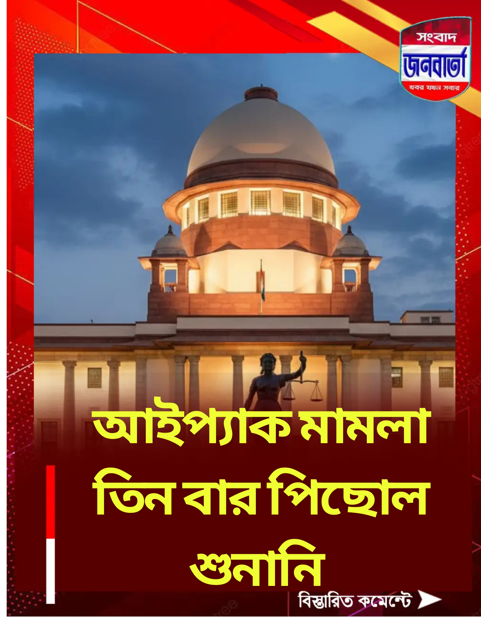 আর্থিক তছরুপের মামলায় আইপ্যাক (I-PAC) এবং মুখ্যমন্ত্রী মমতা বন্দ্যোপাধ্যায়ের নাম জড়িয়ে থাকা বহুল চর্চিত মামলাটি সুপ্রিম কোর্টে আবারও ঝুলে রইল। বুধবার শীর্ষ আদালতে মামলাটি ওঠার কথা থাকলেও তা পিছিয়ে দেওয়া হয়েছে। এই নিয়ে টানা তিন বার শুনানির দিন পরিবর্তন করল আদালত। তবে এদিন সুপ্রিম কোর্ট মামলার পরবর্তী শুনানির একটি নির্দিষ্ট তারিখ ঘোষণা করেছে।