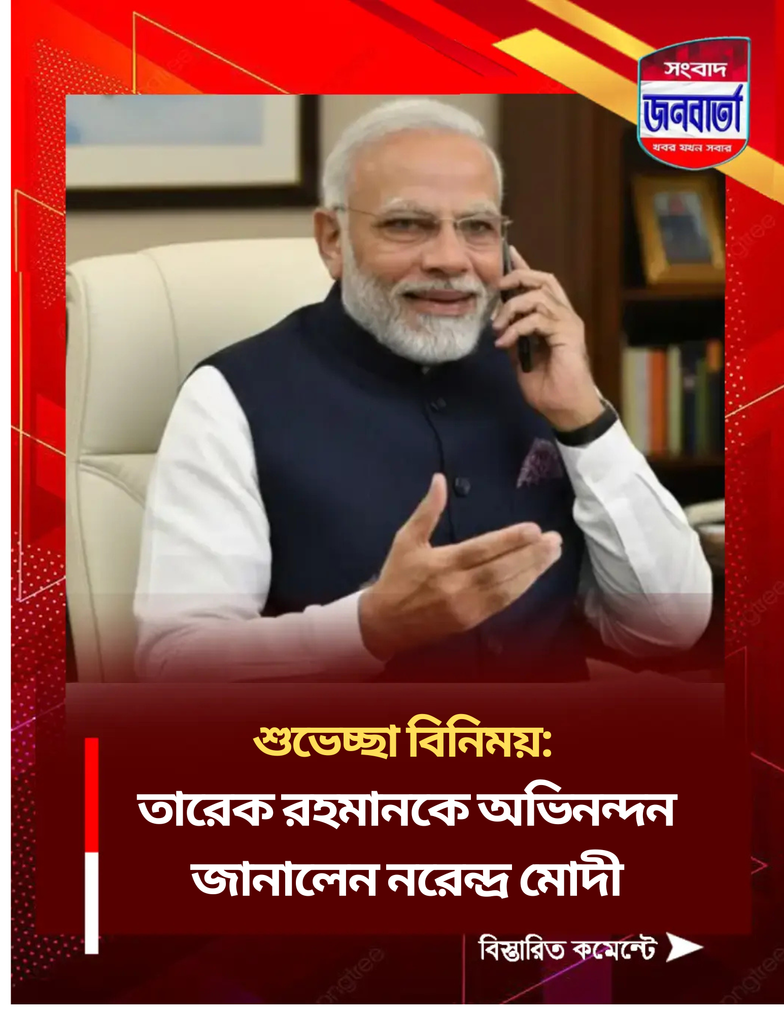 “বাংলাদেশের সাধারণ নির্বাচনে জয়ের জন্য তারেক রহমানকে আমার আন্তরিক অভিনন্দন। ভারত ও বাংলাদেশের জনগণের মধ্যকার ঐতিহাসিক ও সাংস্কৃতিক সম্পর্ককে আরও সুদৃঢ় করতে আমরা একযোগে কাজ করার প্রত্যাশা রাখি।”